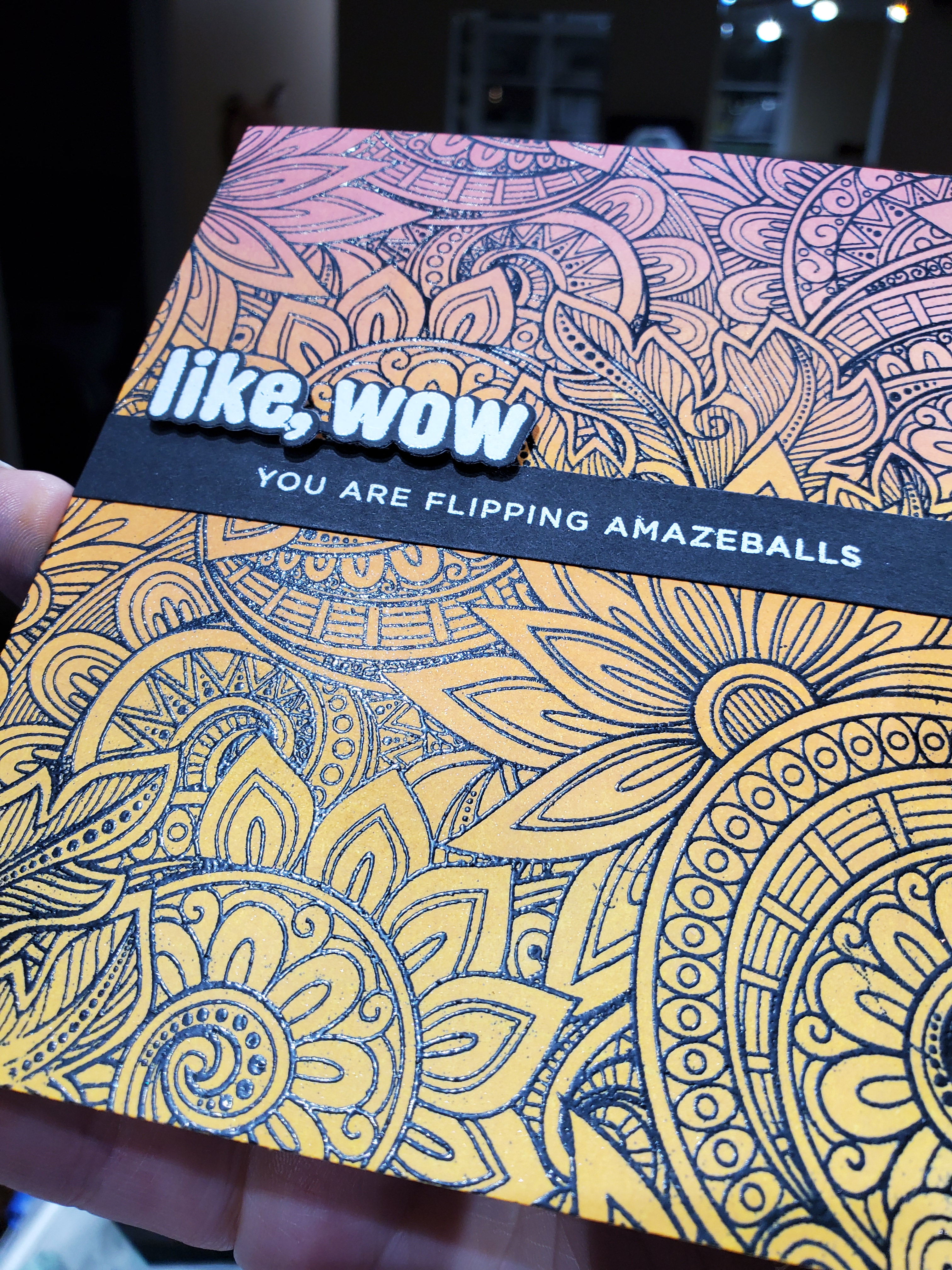****i found this made my black embossing a little dull. In retrospect, if you know you’re going to use distress inks, just wait and emboss after for a better black finish. - Take black scrap paper, apply embossing buddy, stamp “like wow” and “you are flipping amazeballs” in versamark and emboss in white. Emboss a second time for a good solid white image