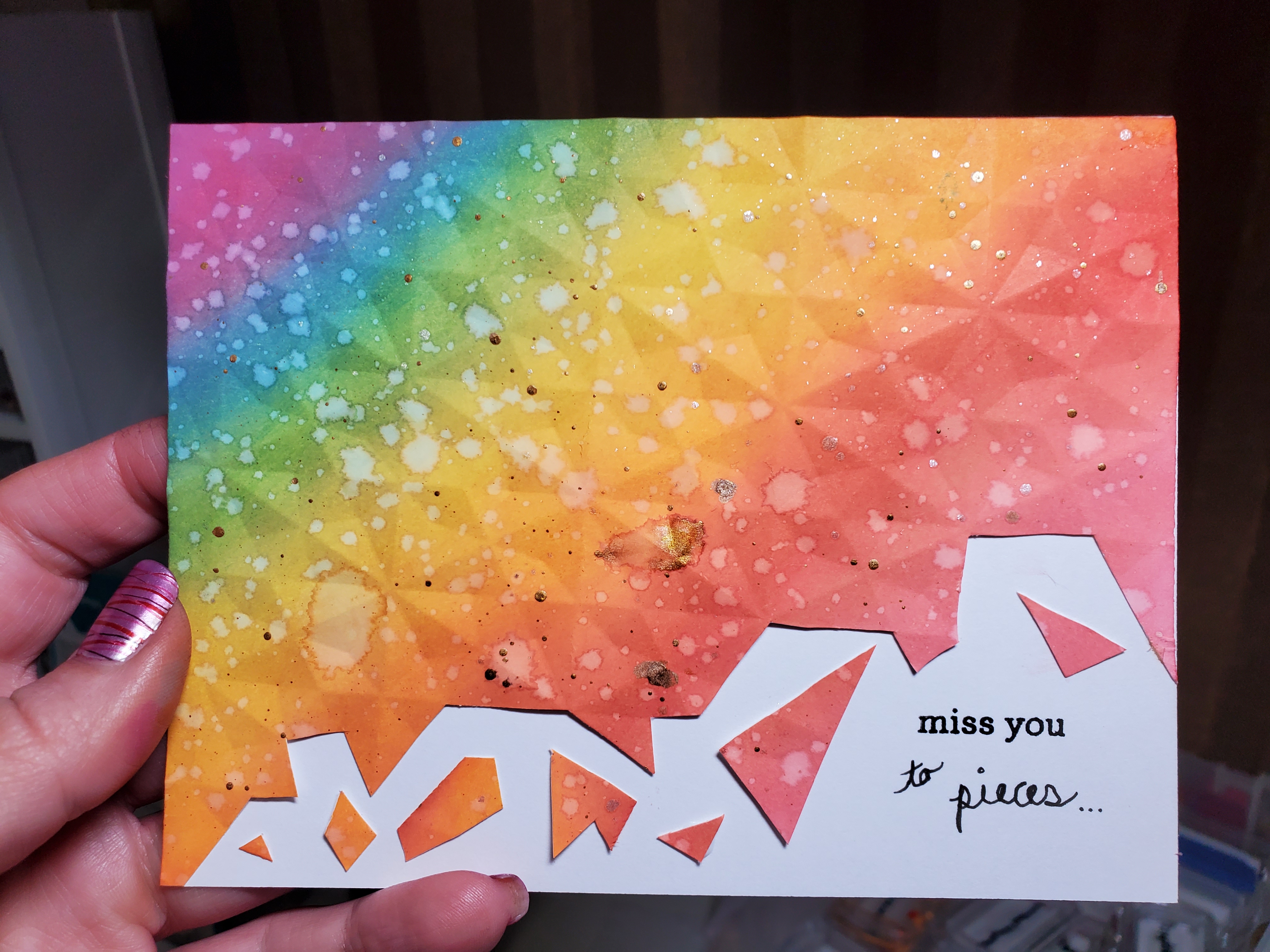 I really wanted to make my own – I used Distress Oxides and a different embossing folder by Gemini – but I need a “missing you” card for my friends across the country.