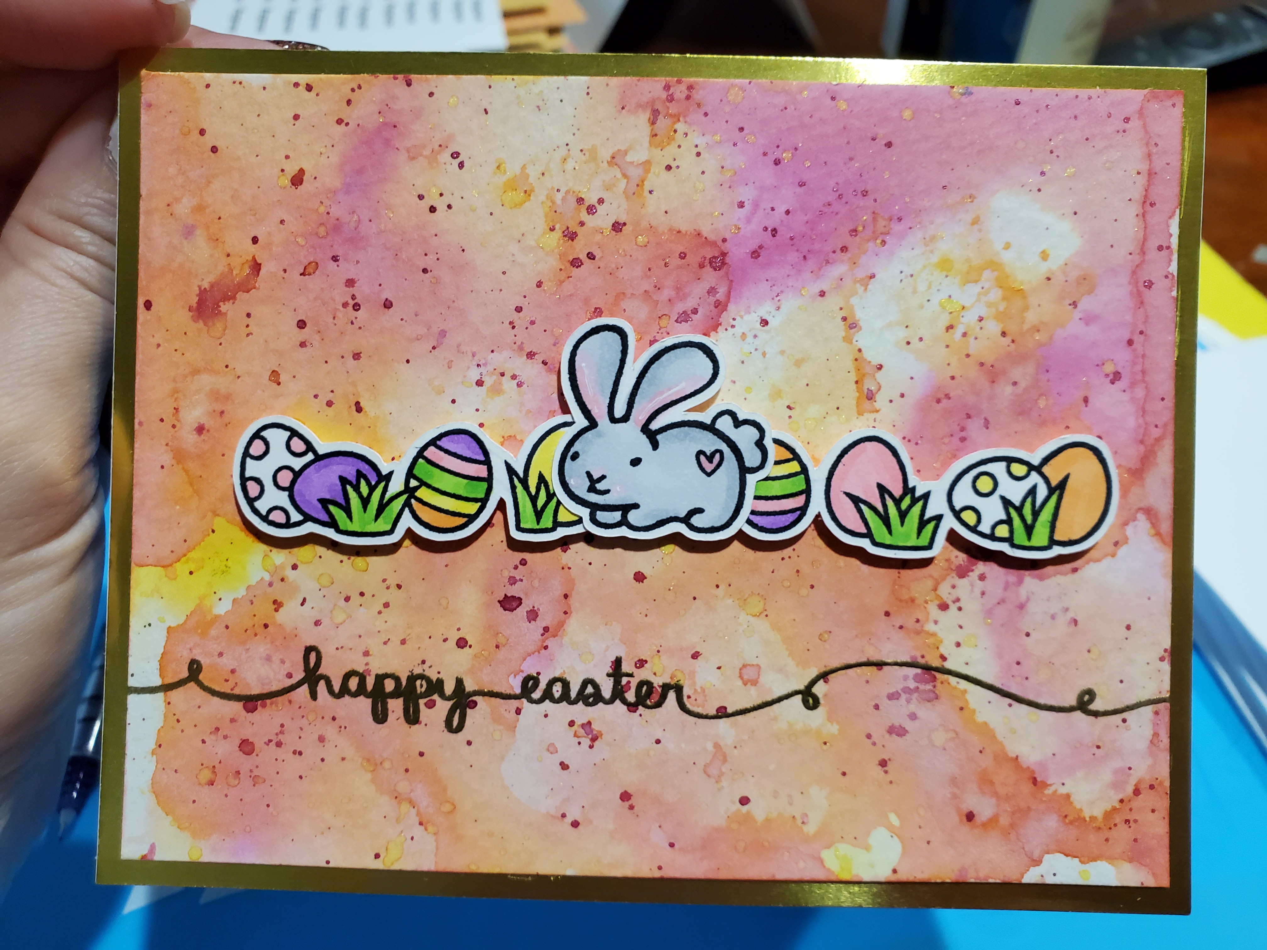 Sorry, but there is a LOT of shimmer that photos just don’t do justice. Gold paper frames the card, gold embossing for the sentiment and then nuvo shimmer powder was used for the splatters.
