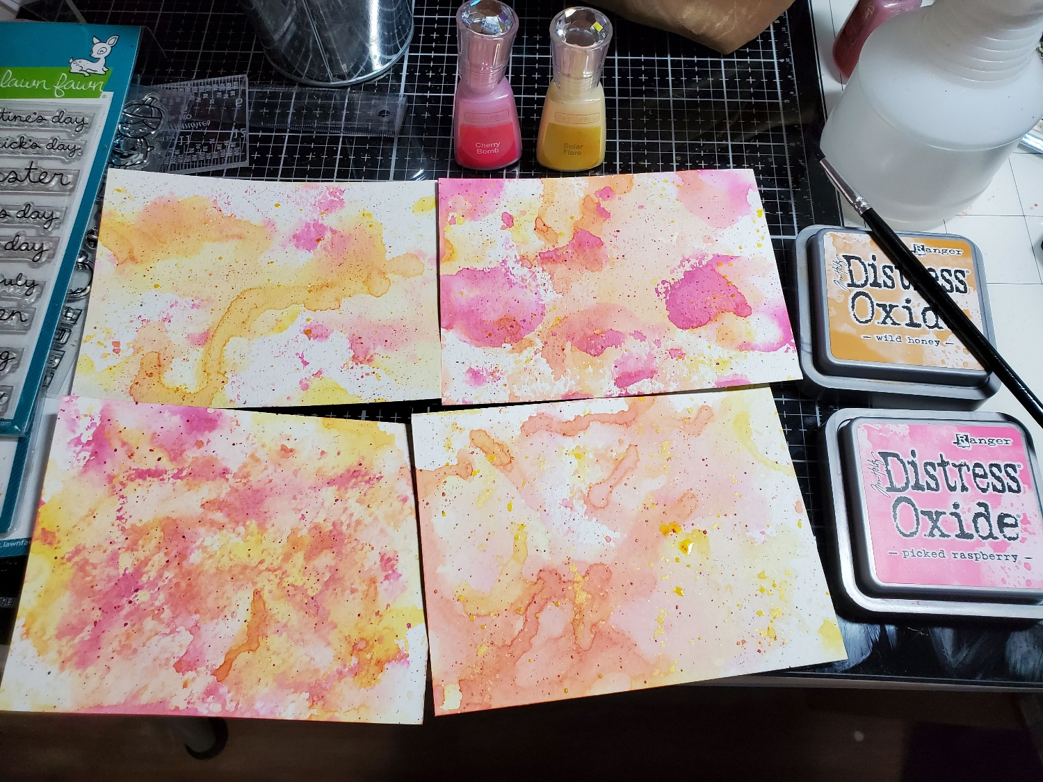 - Take distress oxide inks and smoosh the ink pad directly on your media mat. Spritz with water – move around with a paint brush to your taste for a base color if desired, mine made a peachy color. Apply to watercolor paper to taste. Dry with heat gun in between layers to get overlapping lines/blends.