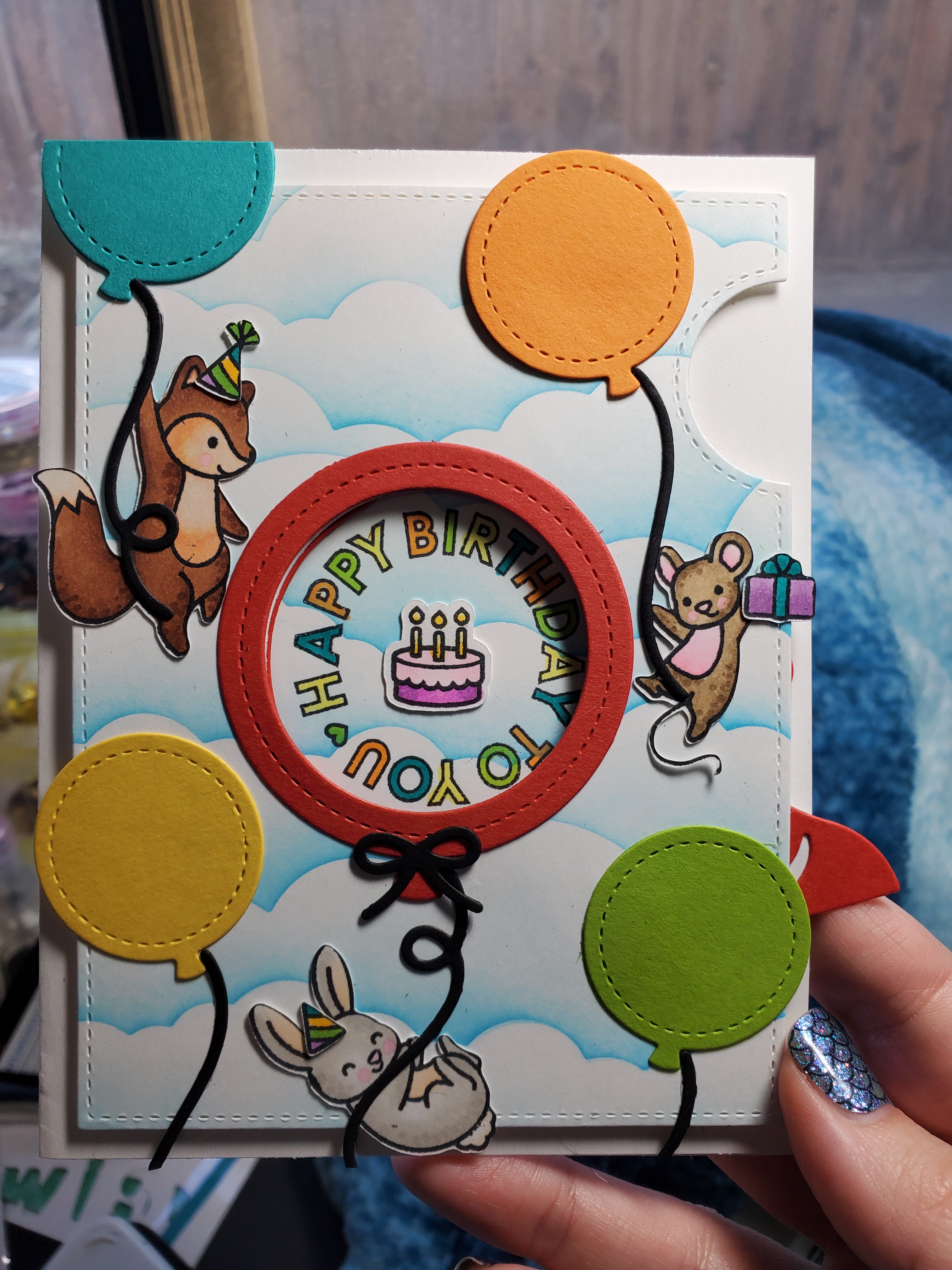 The balloon opens to reveal a sentiment from the Reveal Wheel Circle Sentiments and a cake from Beam Me Up.