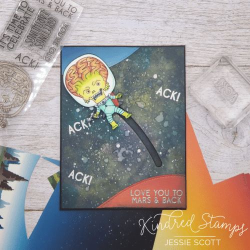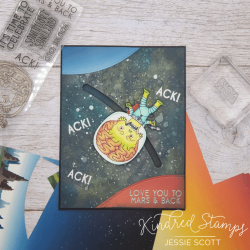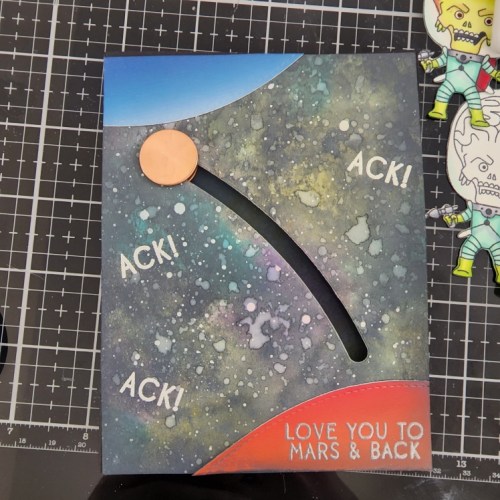 I used a curved cut out from the Galactic paper pack for planets, embossed the sentiment and a few “AK” s on the background. Then I used a track die from my stash and put the alien on a penny/dimensional/penny sandwich (hidden behind the track) and popped up on a dimensional on the top part of the track. Now he spins both directions to my red planet and my green/blue planet! We use a penny technique because the weight of the pennies will help the object slide and spin easily.
