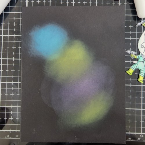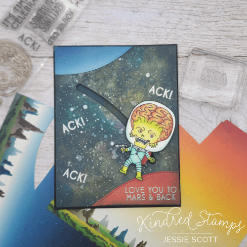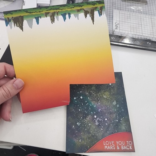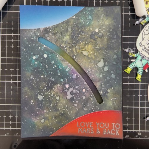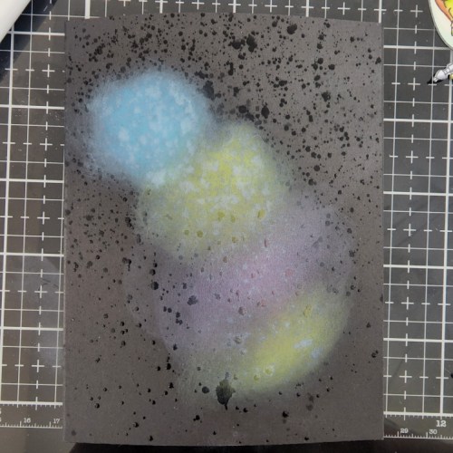 OK lets have a little crafty fun…. have you ever made a galaxy background? I have a tutorial HERE: “Space the Final Frontier” on how I made some fun galaxy backgrounds to have on hand for these cards. So much fun using some water-based inks smooshed with Black Soot distress oxide ink in many layers and then splattered with water and white acrylic ink with a hint of sparkle!