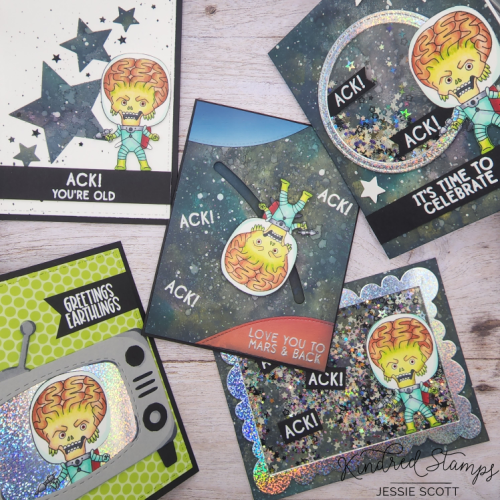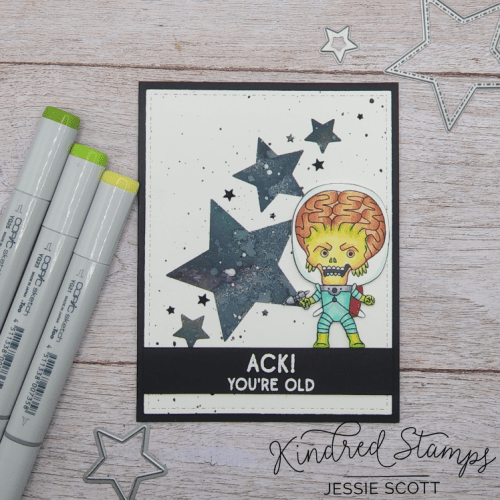 I had some glitter cardstock from my stash to give it a “we are invading” static behind the alien. Love this simple look!