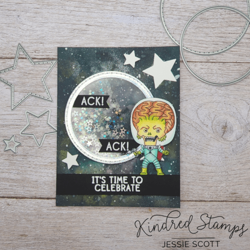 So on to these shakers. First one I made a frame using the Kindred Stamps Card Basics Dies circles. Glow-in-the-dark and other fun shaker bits from my stash make this card so much fun! Notice the white star accents? hmmm… looks like those fit in the holes left from the other card… hmm… USE YOUR LEFTOVERS! hah!