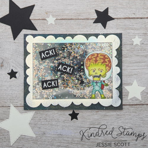 Now this card, I found a fun wonky scallop die in my stash and used it for the large frame for this shaker card. Same shaker bits (why change a good GLOW IN THE DARK thing?) hah.