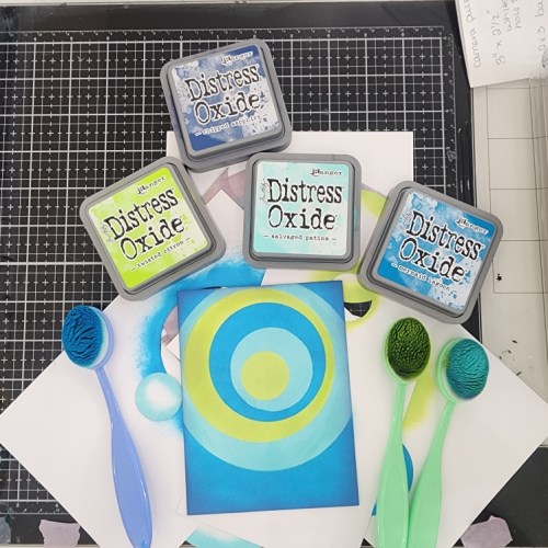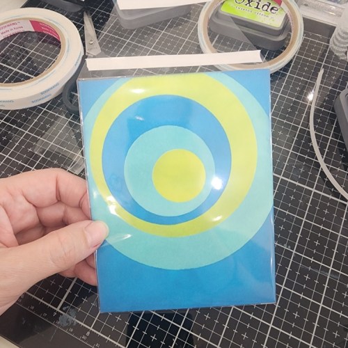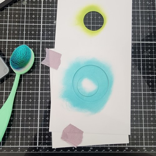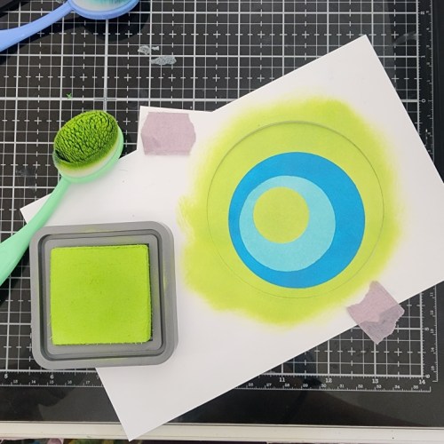 Speaking of making your own stencils… I used my cutter to cut out several different sizes of circles to create this hypnotizing card for my silly serpent. I used distress oxides for a fun pop of color.