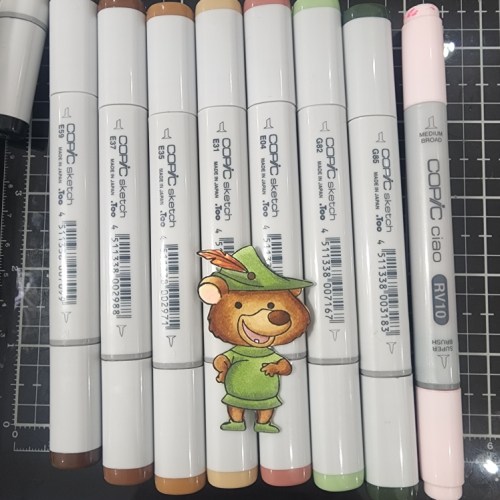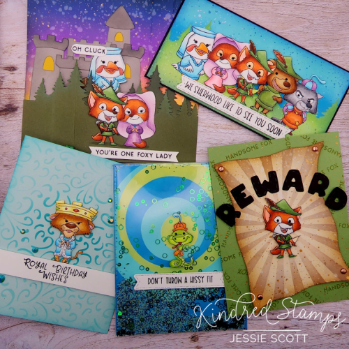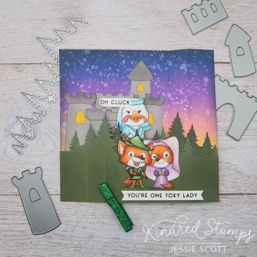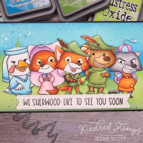 For the second card I made a quick paper stencil using the tree scene craft die and distress oxides to make a forest background and spritzed with water and splattered with kuretake gems and pearls water color paints. The sentiment actually said “I Sherwood…” But I wanted it to be a group card with “we” so I added the little details to the “I” to make it an “E” and then copied the “W” with a fine liner pen.