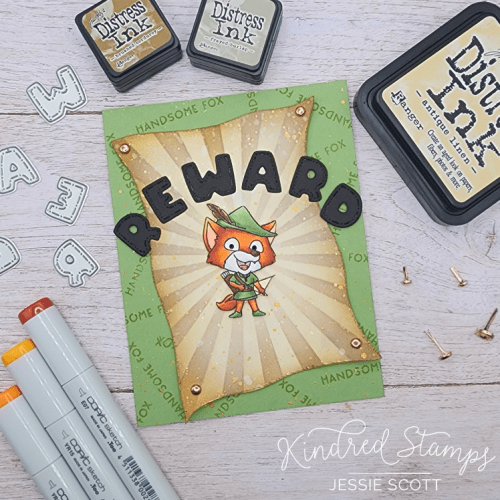 REWARD is created with the Stitched Alpha dies. I freehanded a cut poster, roughed the edges with old scissors and ink blended with distress ink for some fun dimension. I added brads for a “nailed” effect.