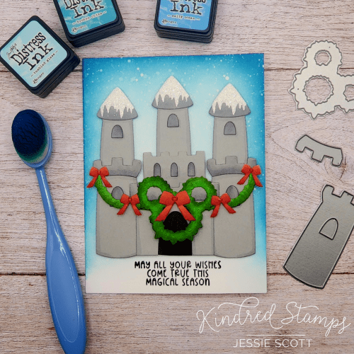 Snow caps for the towers and garland, wreath, and bows for accents. I cut all of the add-on elements out of white paper and colored them with copics for extra details. Don’t have the Castle Die yet? It’s in stock right now for this release! I love that it’s a “builder” die where you can make it whatever you need. I also added fine iridescent glitter using glue for a fun sparkling snow finish.