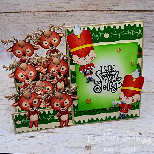 I thought a step card was a fun way to have a bunch of reindeer characters coming down the “street”. I used the paper from the kit to give this card a fun festive vibe.