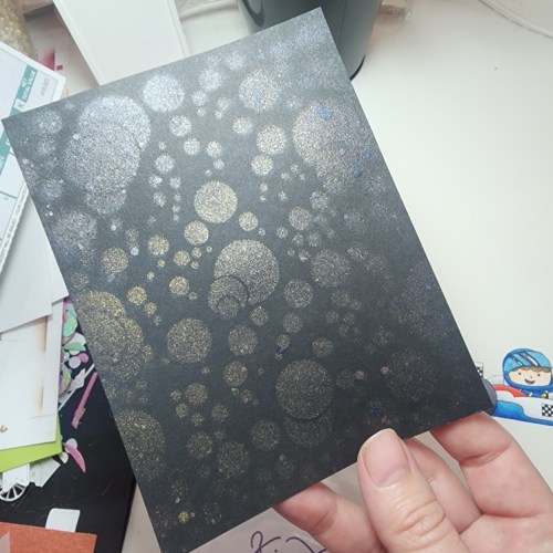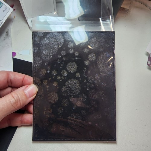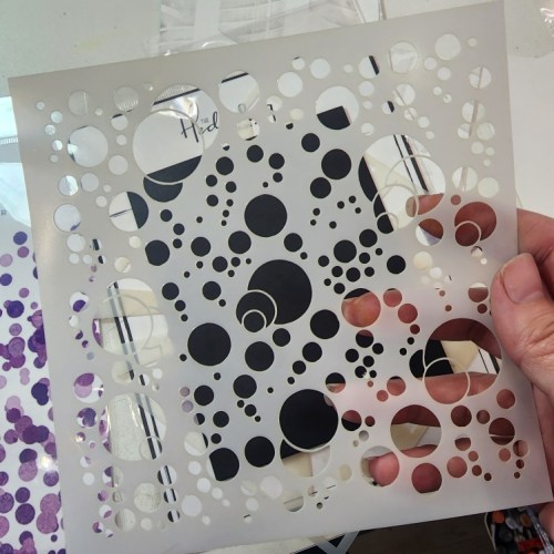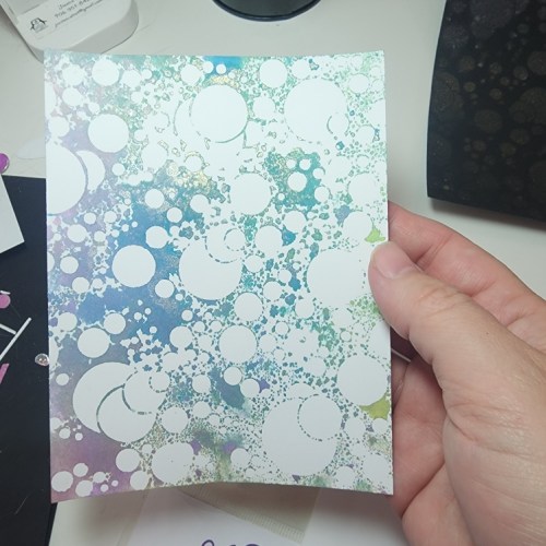 First I used some fun shimmer sprays through the Bubbles Stencil to give a bokeh effect. Don’t forget to always flip your stencils over and press onto another piece of paper to make a reverse panel to use later!! I used 4 different color shimmer sprays on the black, but mostly only the metallic gold and silver show on the paper. BUT you can see the colors on the reverse panel I made, blue, green, pink and purple.