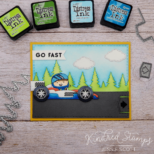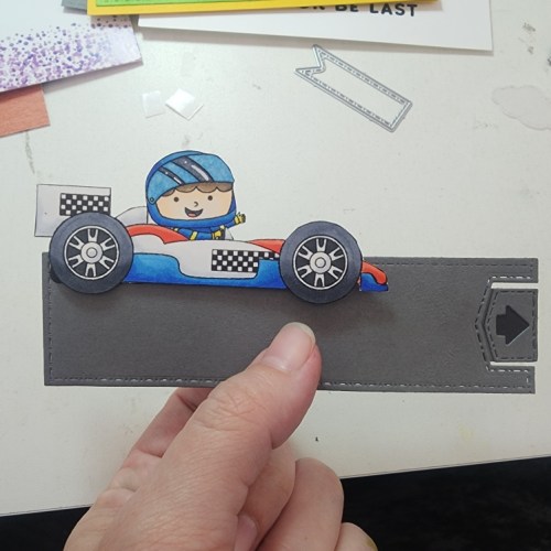 I thought it would be super fun to mask off the sentiment “Go fast or be last” so there is a flagged piece at the top with “Go fast” and then the car pulls aside to reveal “or be last” on the road. TAH DAH!!!!