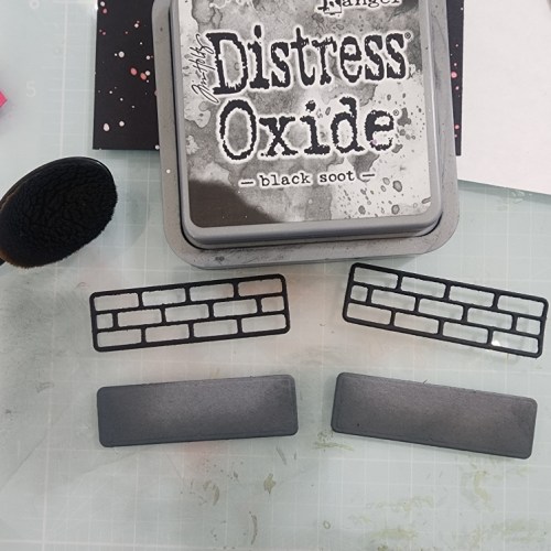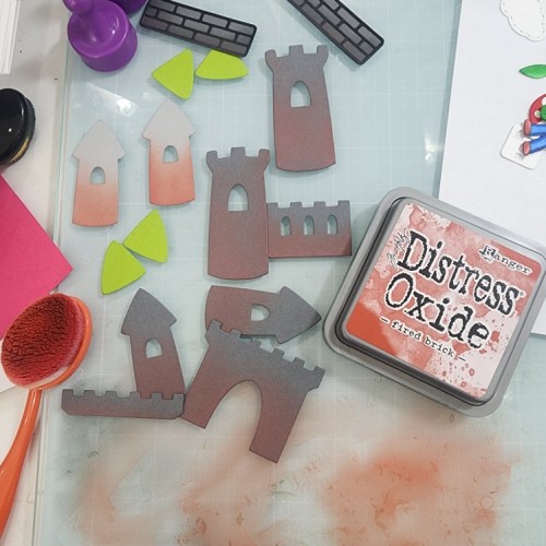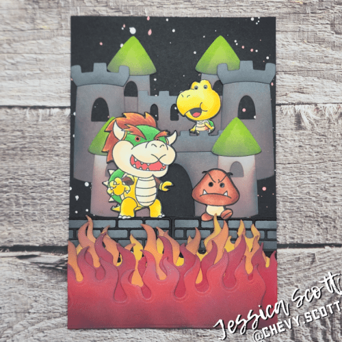 I used the Build a Castle Dies with a dark grey and then green spires plus the Flames Dies layered in red, orange, and yellow to make this fun scene. All the dies were dirtied up with distress ink oxides for a dark, ominous, yet flamey experience.
