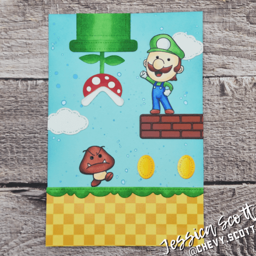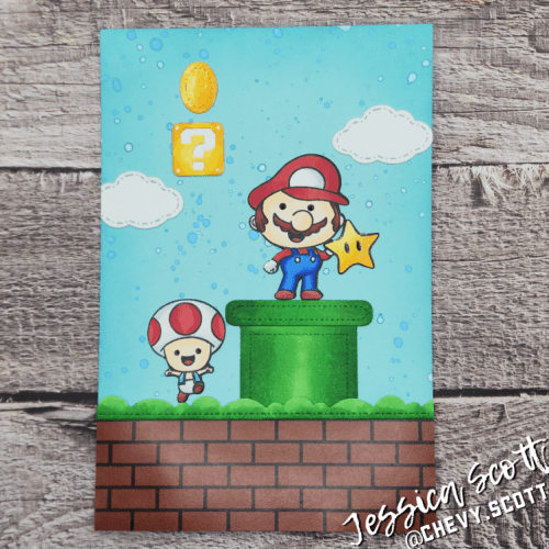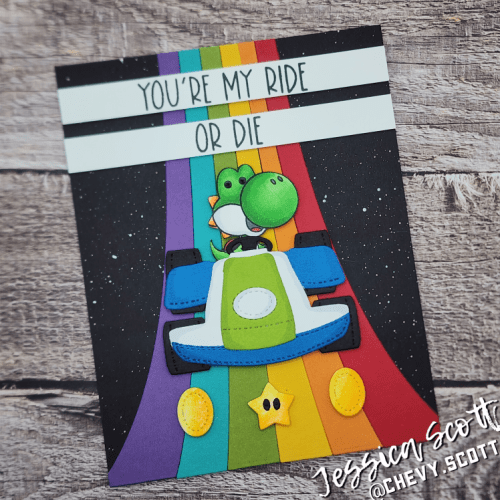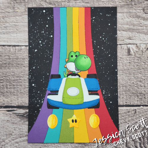 I used MFTs Color Blast Die-namics die to make a fun Rainbow Road for this fun go-kart character card.