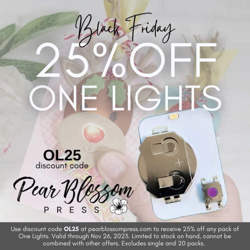 Black Friday Sale on One Lights! Use discount code OL25 at pearblossompress.com to receive 25% off any pack of One Lights. Valid through Nov 26, 2023. Limited to stock on hand, cannot be combined with other offers. Excludes single and 20 packs.