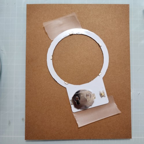 Line up the lights (press to turn them on and look through the front, then temporary tape the halo light to the back of the card front and put double sided tape on the back of the halo light. I do it this way so the light gets placed perfectly on the card base. I have a standard portrait A2 case base (5-1/2″ x 8-1/2″ scored at 4-1/4″) ready to go. Remove the double sided tape backing and then flip over the card front to place on the card base. Gently pull up and remove the temporary tape.