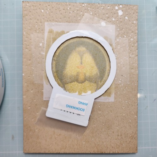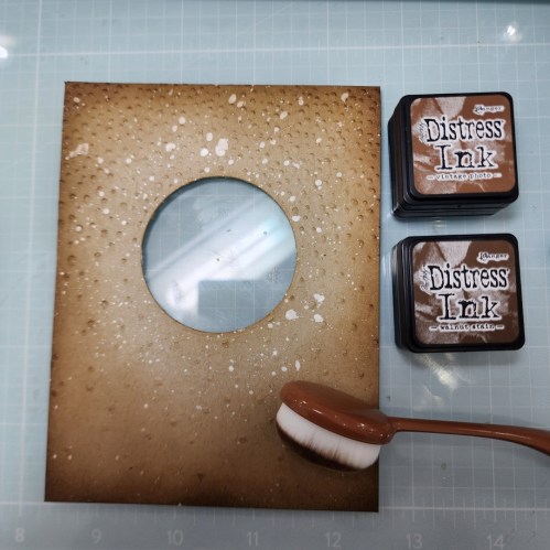 Trim the Kraft cardstock to 4-1/8″ x 5-3/8″ so we will have a 1/8″ border of the card base. I took a 2″ circle die and cut out a circle in the Kraft cardstock centered left to right and then that same distance from the top to leave room for a sentiment on the bottom. I added interest by adding splatter and then inked the outer edge with Vintage Photo and Walnut Stain Distress Inks.