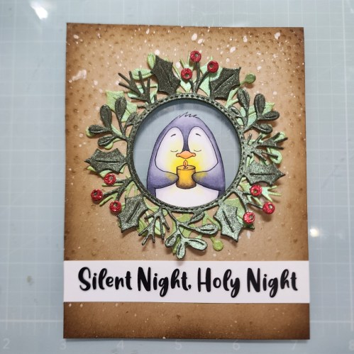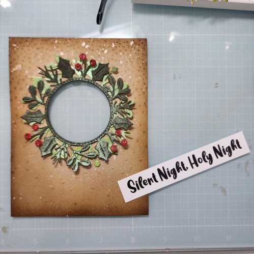 For a sentiment I didn’t have one on hand just the way I wanted it so I printed out a custom sentiment “Silent Night, Holy Night.” I glued the sentiment strip flat to the card front because I plan on mailing this card and want to leave room to have our halo light behind the circle window.