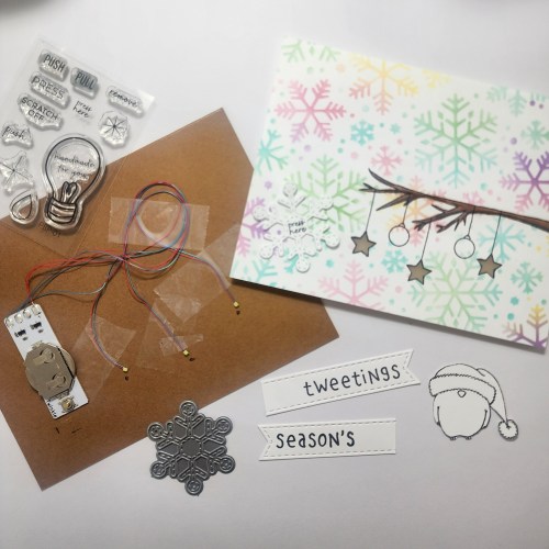 I cut out one of the Lawn Fawn Stitched Snowflake Dies and stamped “press me” from the Pear Blossom Press Stamp and Die Set. I adhered this to the card in the bottom left and lined up with the Pear Blossom Press Twinkle Lights button.