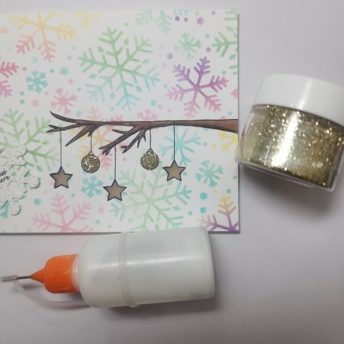 I thought coloring the round ornaments would look plain on this card so I added liquid glue and covered in fine gold glitter.