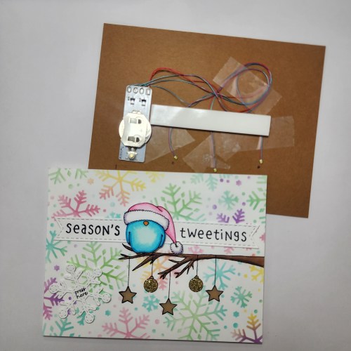 Now I am ready to go! I sat the card front on top of the card base and turned it on to make sure it all lined up, FABULOUS! Then I added the Pear Blossom Press World’s Greatest Foam Tape on the edges and added one strip to support the middle and also help hold down the lights permanently. My birdie is up on some thin foam just to give a little dimension with the sentiment strips glued flat behind him.