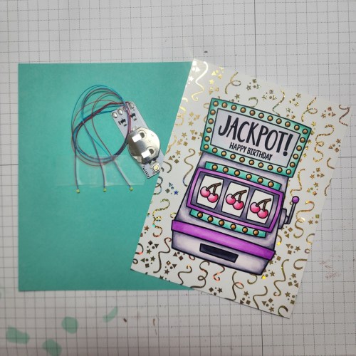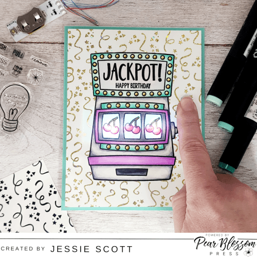 First I colored these fun gambling machines from Pink and Main’s Jackpot set. This one is especially fun because even without lights you can make it as an interactive scratch off! Stay tuned for my next post on how to use the Jackpot companion dies and Pink and Main Scratch-Off Sticker Sheets.