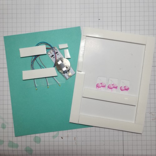 I lined up my stamp in my Misti and inked only the cherry windows on the background so I could cut holes for the Twinkle Lights to shine through.