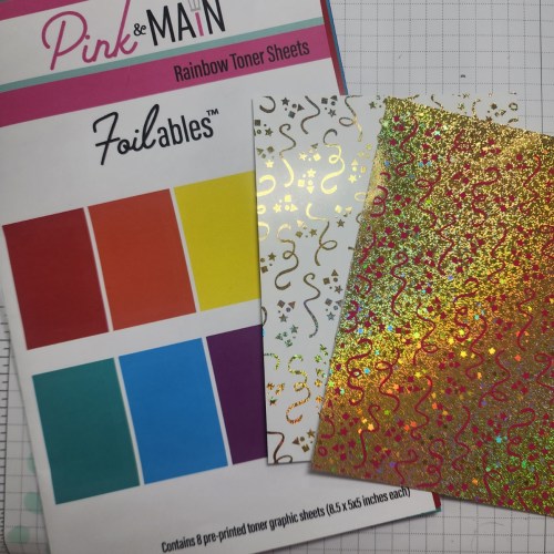 I used the NEGATIVE of yesterday’s super fun Pink and Main Confetti Foilable Panels with the Starry Gold CheerFoil. To do this, you take that negative sheet, place it on the pink toner sheet from Pink and Main Foilable Rainbow Toner Sheets pack and run it through my MINC like the original panel. Now you get the foil in reverse with pink showing through! It’s an awesome 2fer1!