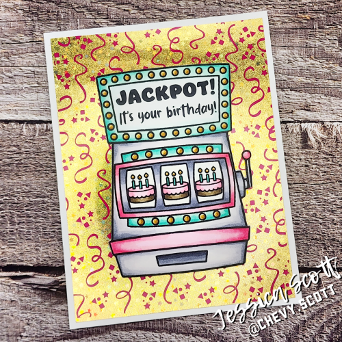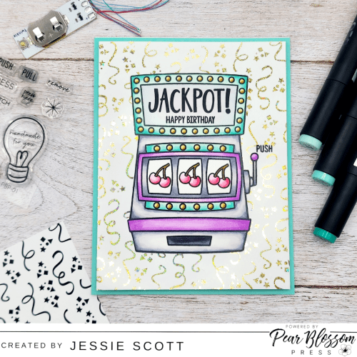 Since I was using a pink toner sheet Still the same stamps from Pink and Main’s Jackpot set. This one is especially fun because even without lights you can make it as an interactive scratch off! I used the Jackpot companion dies and Pink and Main Scratch-Off Sticker Sheets to cut out matching stickers to cover the light up sign words and the slot machine results.