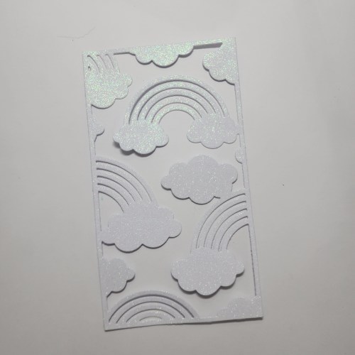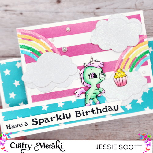 I didn’t have any shape dies I liked and saw the Crafty Meraki’s Over The Rainbow Mini Slimline Para-Dies and had an idea! I ran it through the die cut machine with glitter paper and trimmed off the pieces I wanted. I then colored the rainbow parts with my OLO Markers and trimmed off extra clouds (from a second copy of the cover plate die cut) to popup a little and offset.
