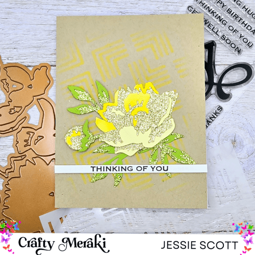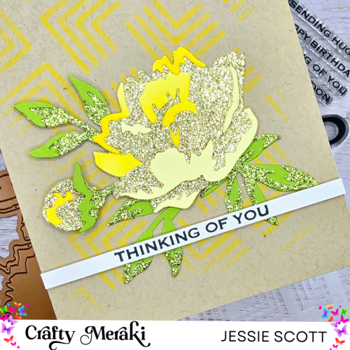 This card is showcasing the new Peony Artisan Flora Para-Dies. I used gold glitter paper to alternate some of the layers so this flower has lots of shimmer and shine! The background is a subtle blend of distress oxide on Kraft paper using the Mosaic Maze Stencil. Thinking of You sentiment is from the Hey Stamp Set in the same release.