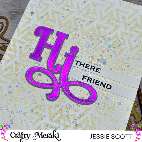 This week we are focusing on sentiments so I added a subtle background using Shape Shifters Stencil and a mica spray. I added a little shimmery splatter for an extra color touch. The focal point is the new Hot Foil Plate “Hi” with a sentiment strip from the coordinating stamp set. “Hi” is foiled with a tone-on-tone look with purple Glimmer Hot Foil onto a lighter purple cardstock.