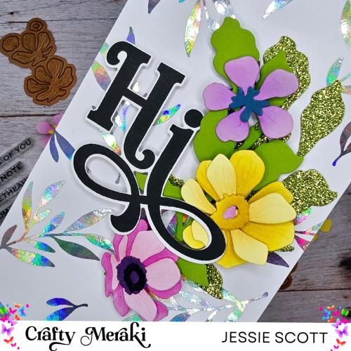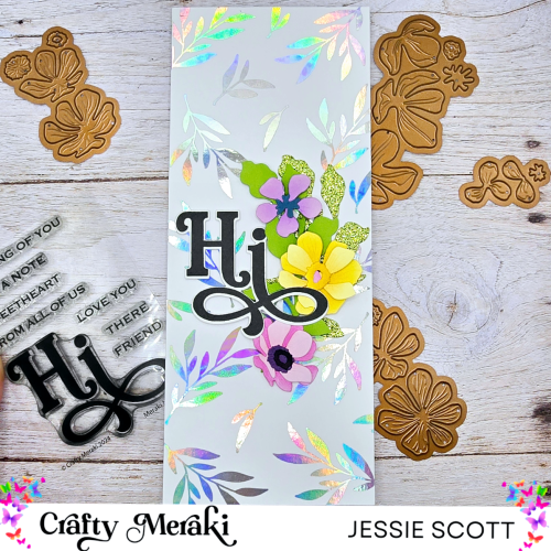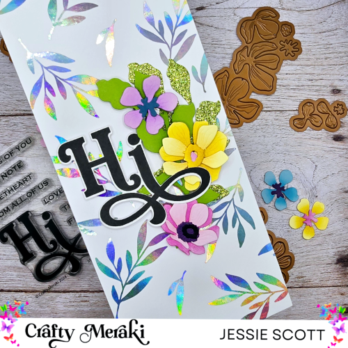 Today I’m showcasing the new Crafty Meraki Wreath Builder Artisan Flora Para-Dies. I die cut the flowers in pastel card stock colors and used distress ink to blend on a variety of different colors. The leaves are die cut in green and green glitter cardstock. “Hi” sentiment is a foam tape popped up die cut using the “Hi” stamp set from the same release. The background is a panel from the “Luminous Leaves” Effortless Shimmer Paper using Deco Toner Foil “Iridescent.”