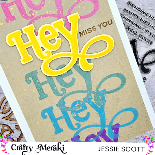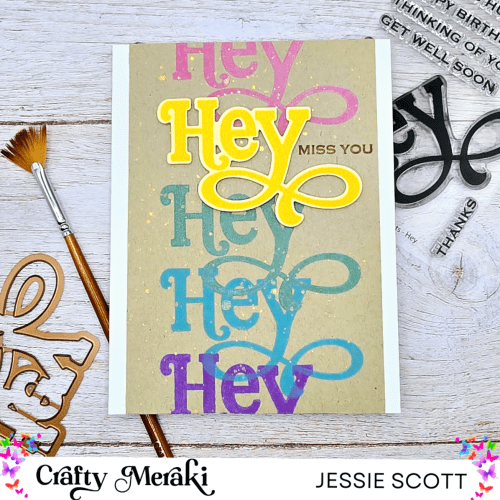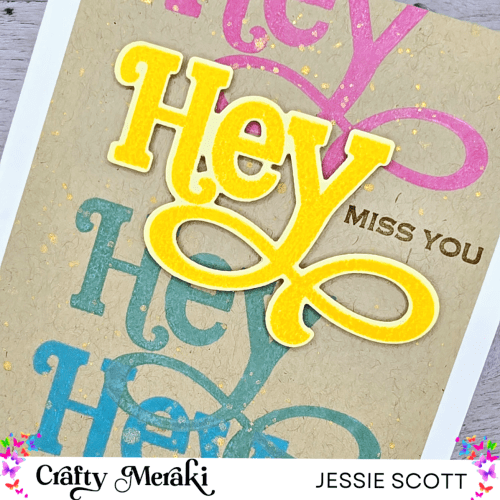 This card is showcasing the new Meraki Moments stamp “Hey.” I used distress oxide pigment ink (Mustard Seed, Wilted Violet, Broken China, Evergreen Bough, Picked Raspberry) to stamp on a colored array onto the background. The yellow “Hey” is stamped on yellow cardstock and on foam tape for fun dimension. “Miss you” is one of the accompanying sentiments in this set and is stamped tone on tone. I added some water splatter to activate the distress oxide and topped with a gold splatter from my Kuretake pallet.