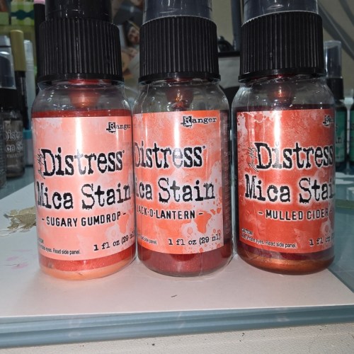 First I cut out all the pieces for the Welcome Home Bun Bun from Picket Fence Studios in white card stock. Then I used a fun arrangement of Tim Holtz Mica Spray Stains to color each piece before assembling. I even masked off the house base piece and sprayed on and orange in the center and the ends with greens so I had an extra layer of depth to play with.