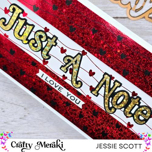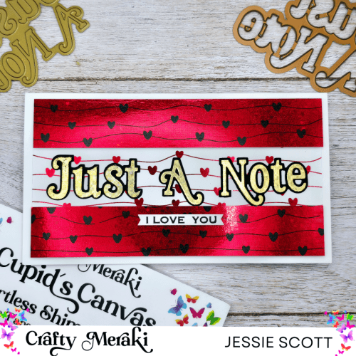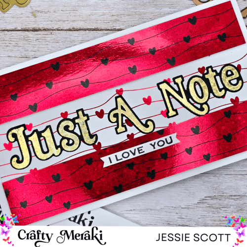 “Just a Note” is foiled using my Glimmer Hot Foil Machine and gold glitter glimmer foil. Sentiment strip is from the coordinating stamp set.