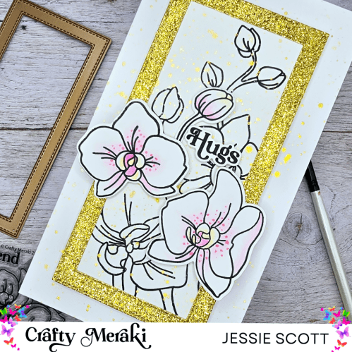 For this minislim I stamped the main branch as a black and white image for the background and added gold watercolor splatter. I then used gold glitter paper to make a cute frame. The pop of color on this card with 3 watercolored flower elements popped up adds fun dimension!