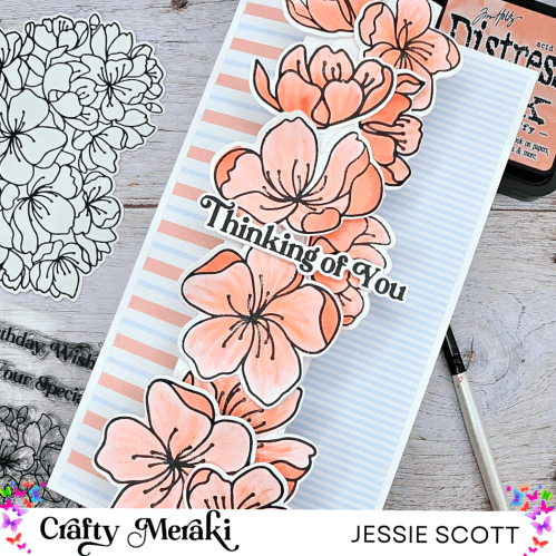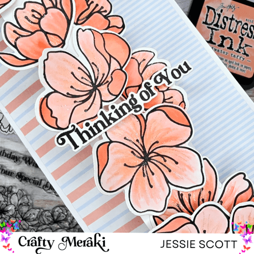 I cut out two sets of the accent flowers, watercolored them with Saltwater Taffy Distress Ink, and arranged them cascading down the half panel. I popped some up on dimensionals and placed the sentiment from the set on dimensionals as well. For some added shimmer, I accented the blooms with a glitter gel pen.