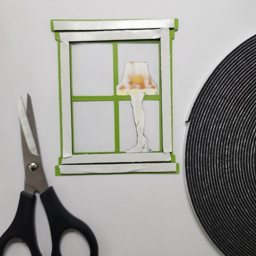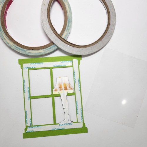 First, I sandwiched the leg lamp in between the acetate and window. I added acetate to the back of the window using scortape, then used thin foam tape to create a shallow shaker (we don’t want thick foam tape since the foam tape around the light will be thick). The light will come through the hole in the black stenciled panel, but I didnt want to leak shaker bits. I added a small piece of acetate over the hole.