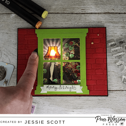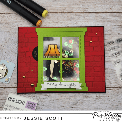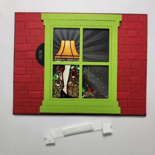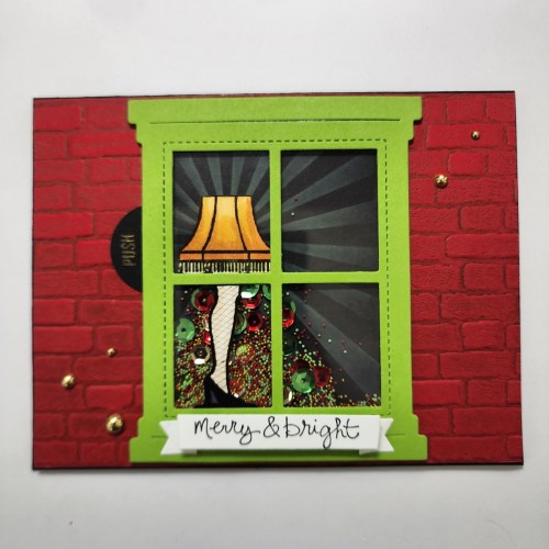 It’s Christmas in July!!! Do you have a favorite Christmas movie you’re waiting to watch? I actually don’t like “A Christmas Story” as a whole movie but I LOVE the leg lamp and some of the fun oneliners haha! I found this leg lamp image online for free, combined with Lawn Fawn window, a brick embossing folder and of course A LIGHT!