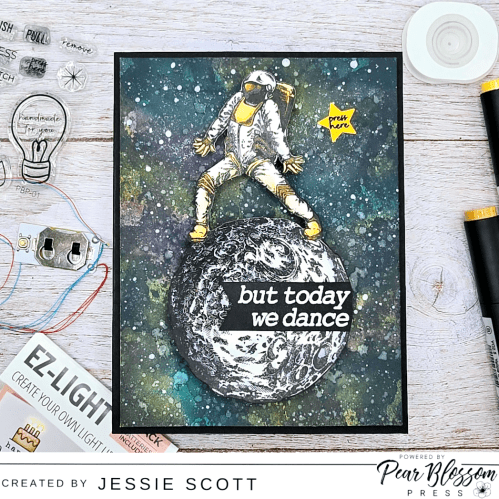 To finish the card, I embossed “but today we dance” from the “Dance Mode On” stamps set from Picket Fence Studios. I used a star punch from my stash and stamped “press here” from the Pear Blossom Press Stamp and Die Set.