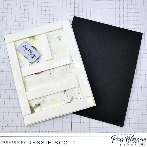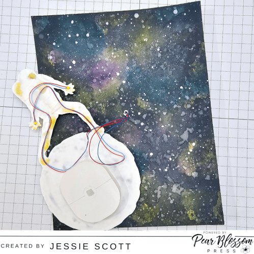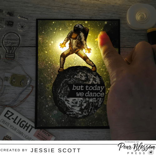I trimmed the space panel down to 4″ x 5-1/4″. To adhere to the black card base, I used the Pear Blossom Press World’s Greatest Foam Tape since it has the perfect height for the battery pack.