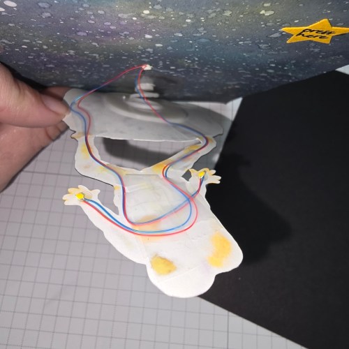 I poked through the space background to feed the lights through and secured them in place with tape and glue dots.