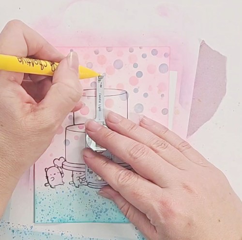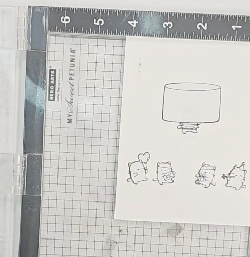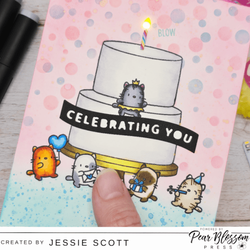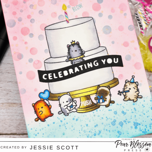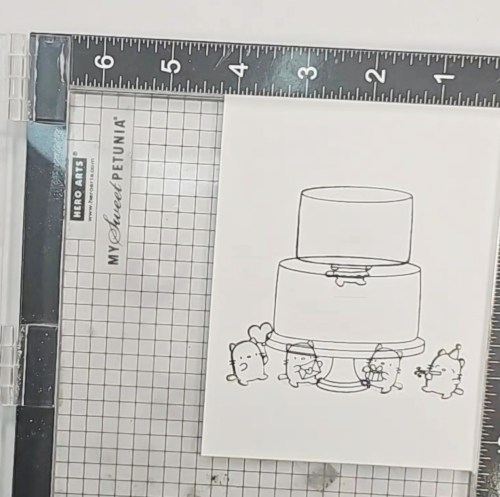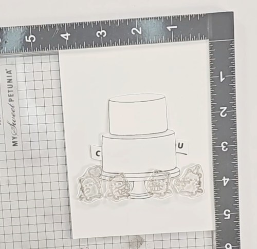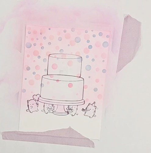 I stamped the kitties first, masked them off and then stamped the top layer of cake, masked it off, then stamped the bottom cake with stand.