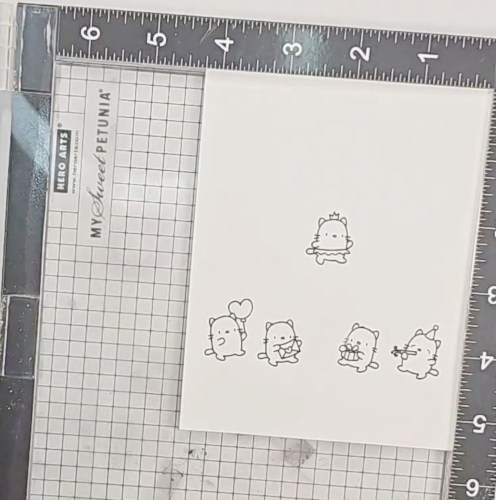 I first took some image cut outs for all the stamps I wanted to use (Mama Elephant Celebration Cake and Little Cat Agenda stamp sets) and figured out my scene. I knew I wanted the furry princess front and center standing on the banner “Celebrating You” over the cake and a party all around.