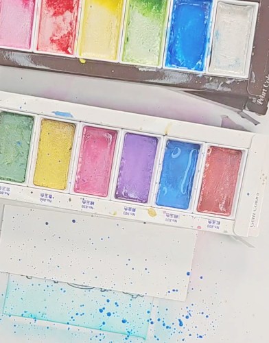 I grabbed my Kuretake watercolors to add some shimmer and shine to the background in gold splatter and two different tones of blue for the table.