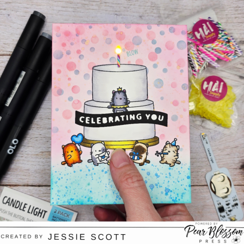 I lined up the Pear Blossom Press Candle Light so I could mark where the flame needed to be. I used the small flame die from the Pear Blossom Press Stamp and Die Set to make the hole for the light to come through. I trimmed a little additional off the bottom of the cut to leave for an air hole for the “blow” to come in and blow out the candle.