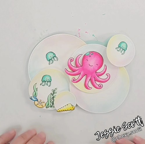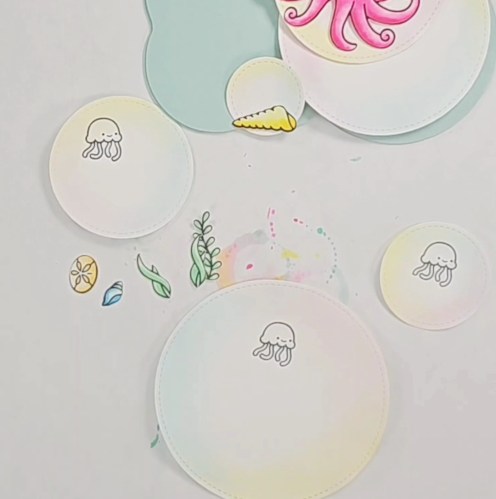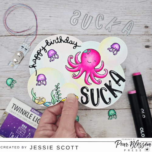 I arrange all my images on the card so I can see where I want my jelly fish to be. I want them to be colored on the bubbles so the light will shine through best from the Pear Blossom Press Twinkle Lights.