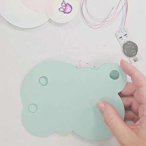 I line up the bubbles with jelly fish up with the top piece and use a 1/2″ circle punch to have holes behind the jelly fish so the light will shine through directly behind them. I also note where the “push” button will need to be and stamp it on the shell using the Pear Blossom Press Stamp and Die Set.